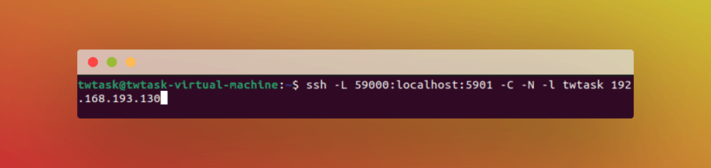 L 59000:localhost:5901: Indicates that the host and port on the destination server, which is localhost:5901 (i.e., port 5901 on the destination server, identified as 192.168.193.130), should receive traffic from the machine establishing the connection. As long as another service is not using it already, you can use whatever local port you like.